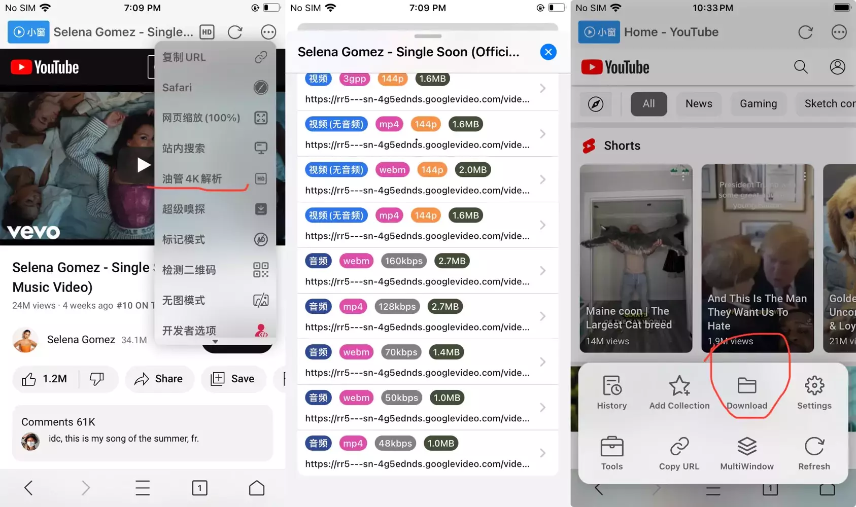 If you prefer a higher download speed or download lots of YouTube videos to MP4, I recommend YSBorwser. It is a browser app that allows you to download videos from many websites. Some words in the app is in Chinese, so refer to the screenshot below to use it.